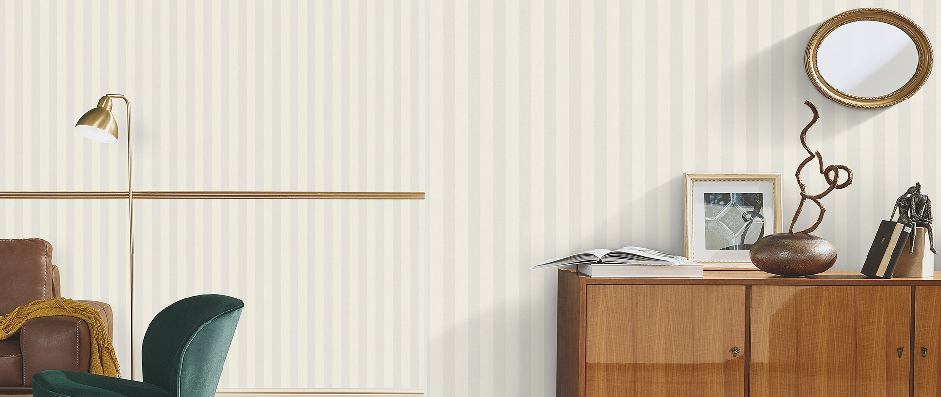Die klassischen Streifen des Designs bieten Kontrast zu den opulenten Ornamenten der Kollektion. Die trendigen Farbtöne beige