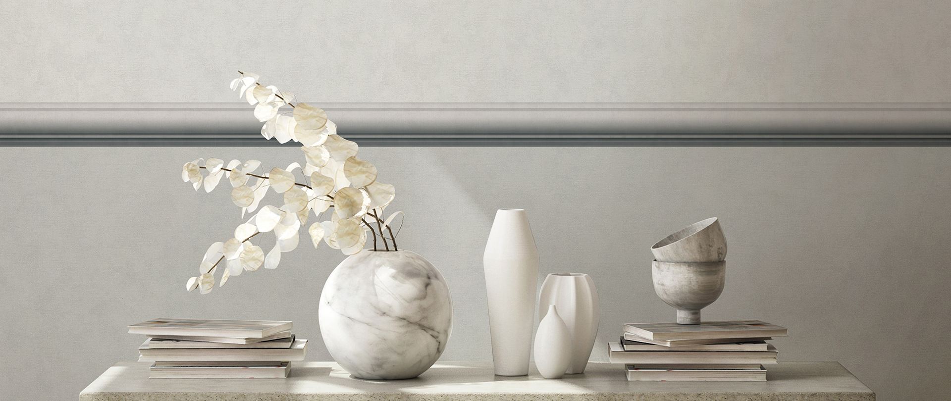 Unsere modernen Tapeten mit dreidimensionalen Stuckelementen, Halbkreisen, Bögen und passenden Unis bieten innovatives Design,